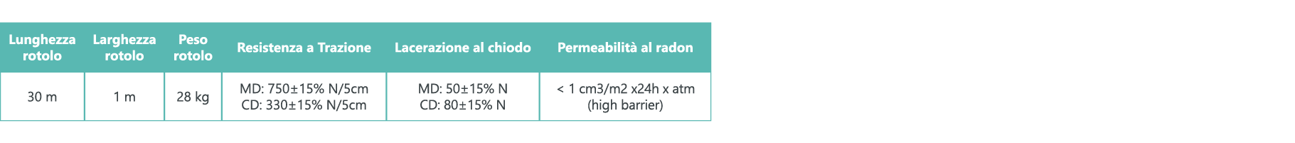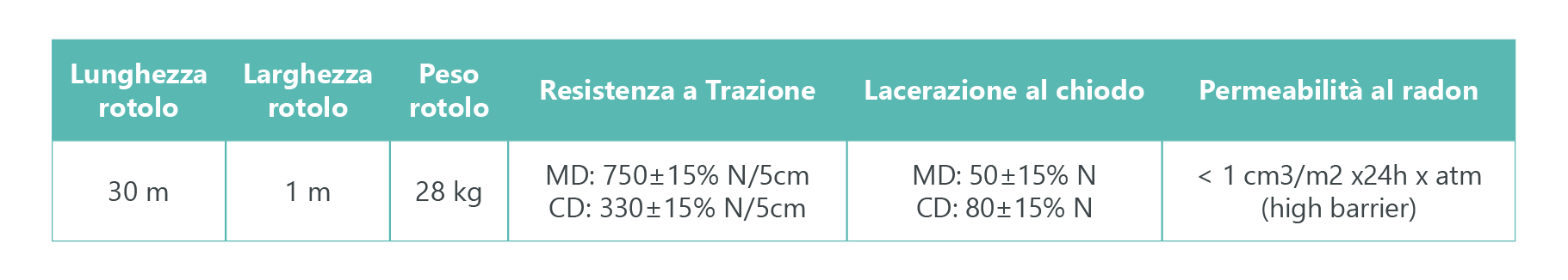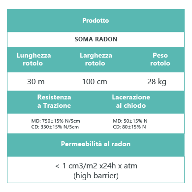 Soma Radon è una barriera ad alte prestazioni contro il gas radon, composta da una struttura multistrato che integra fibra di vetro rinforzata, film in alluminio, compound bituminoso, strato di finitura in polietilene e bande laterali autoadesive per la sigillatura.